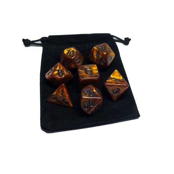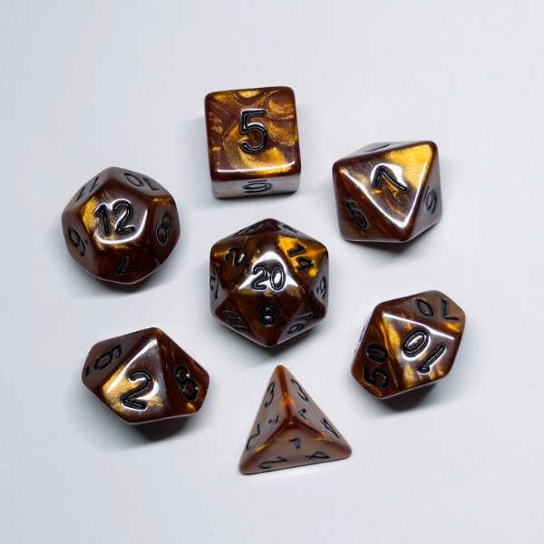 🎲 Prepárate para vivir aventuras épicas con este set completo de 7 dados con un hermoso Efecto Veteado en tonos Cobre y números Negros, diseñado para Dungeons & Dragons, Pathfinder y otros juegos de rol.