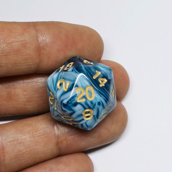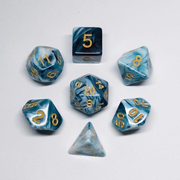 🎲 Prepárate para vivir aventuras épicas con este set completo de 7 dados con un hermoso Efecto Mármol en tonos Azul, Celeste y Blanco con números Dorados, diseñado para Dungeons & Dragons, Pathfinder y otros juegos de rol.