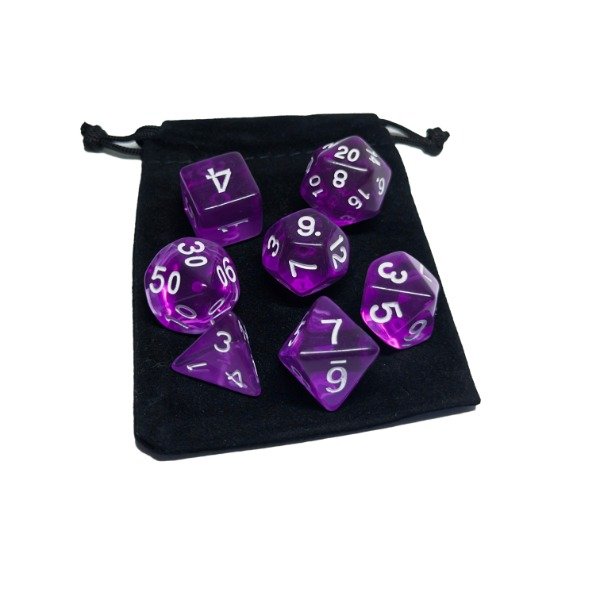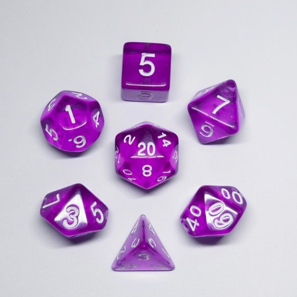 🎲 Prepárate para vivir aventuras épicas con este set completo de 7 dados con un hermoso Color Violeta Translúcido y números Blancos, diseñado para Dungeons & Dragons, Pathfinder y otros juegos de rol.