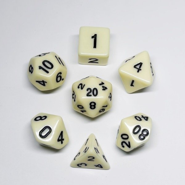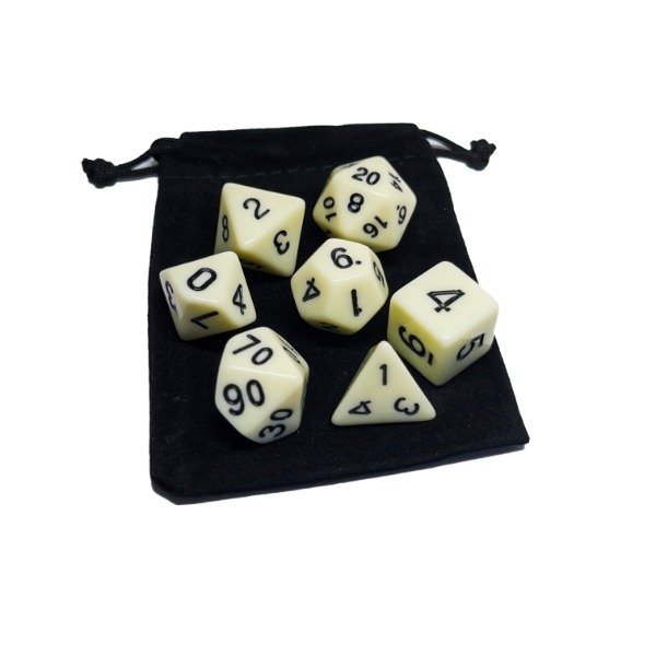 🎲 Prepárate para vivir aventuras épicas con este set completo de 7 dados con un hermoso Color Sólido en tono Blanco Hueso y números Negros, diseñado para Dungeons & Dragons, Pathfinder y otros juegos de rol.
