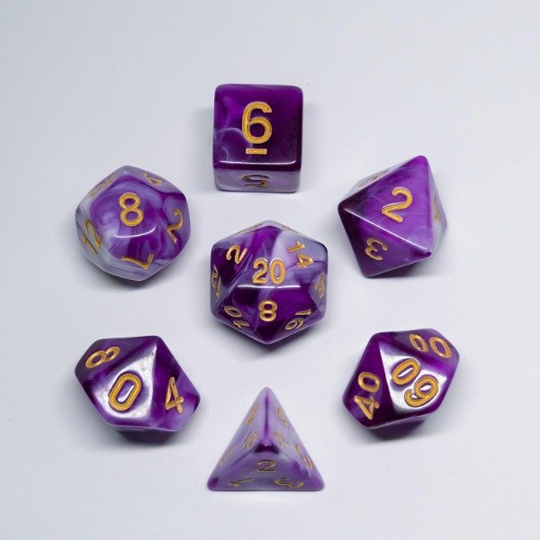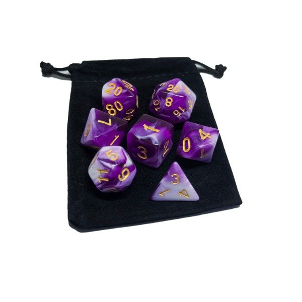 🎲 Prepárate para vivir aventuras épicas con este set completo de 7 dados con un hermoso Efecto Mármol en tonos Fucsia, Rosa y Blanco con números Dorados, diseñado para Dungeons & Dragons, Pathfinder y otros juegos de rol.