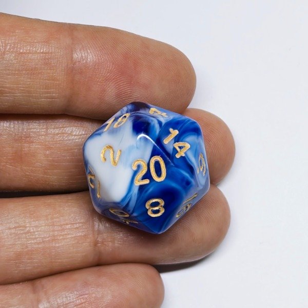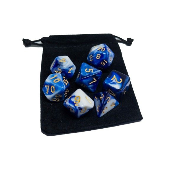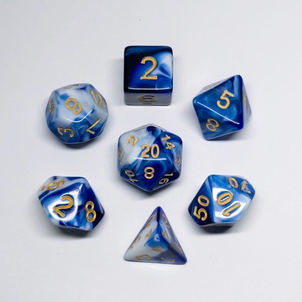 🎲 Prepárate para vivir aventuras épicas con este set completo de 7 dados con un hermoso Efecto Mármol en tonos Azul, Celeste y Blanco con números Dorados, diseñado para Dungeons & Dragons, Pathfinder y otros juegos de rol.